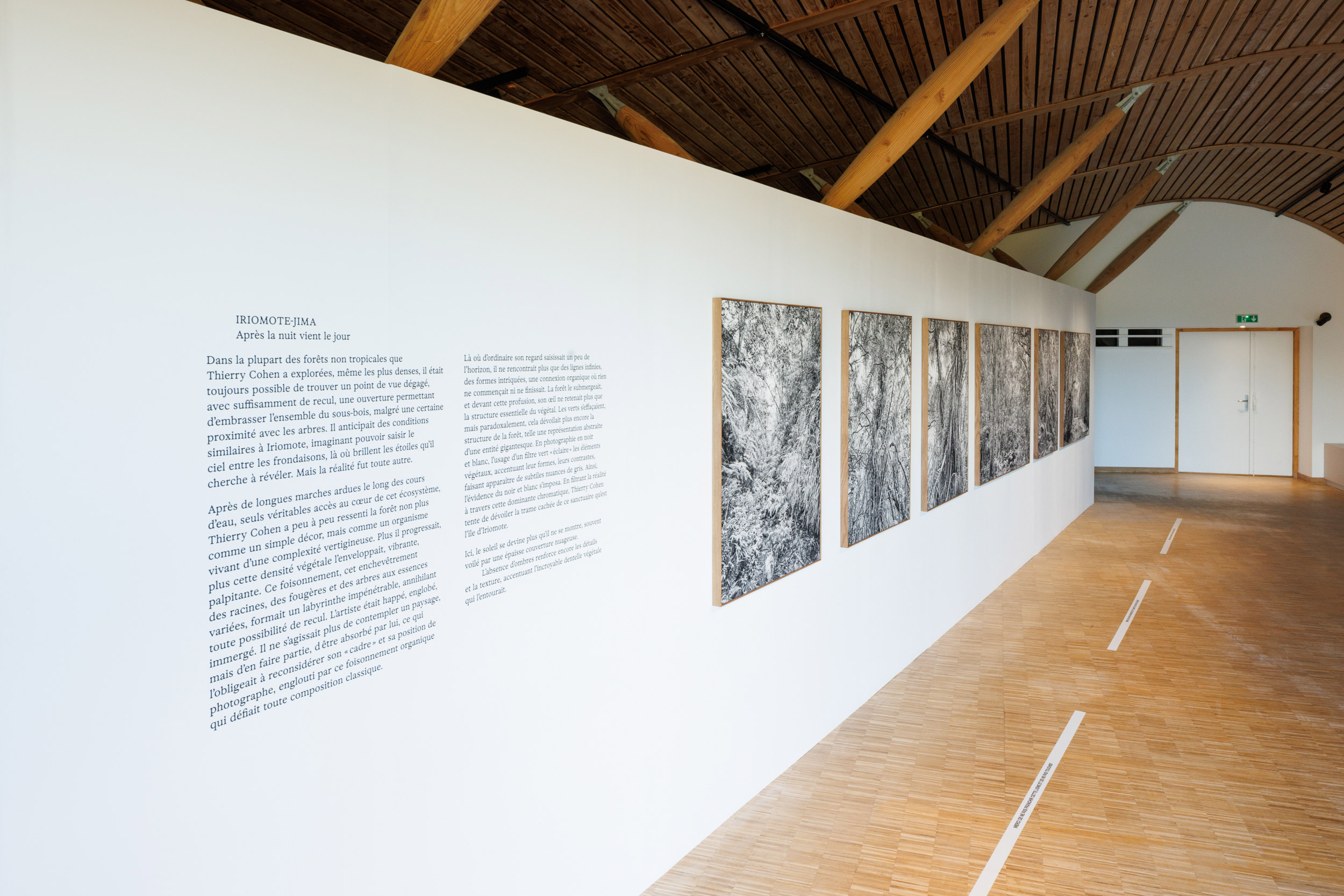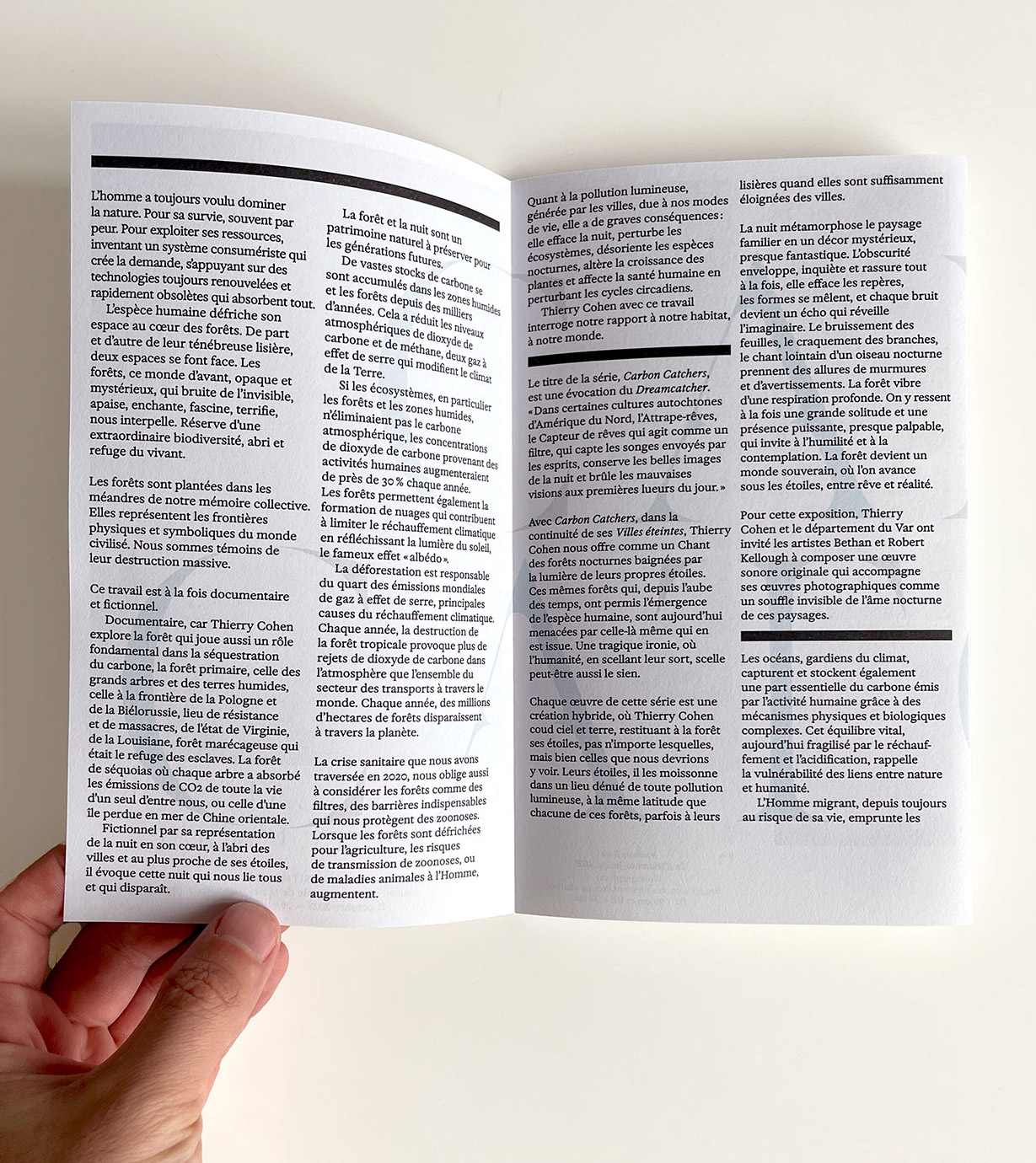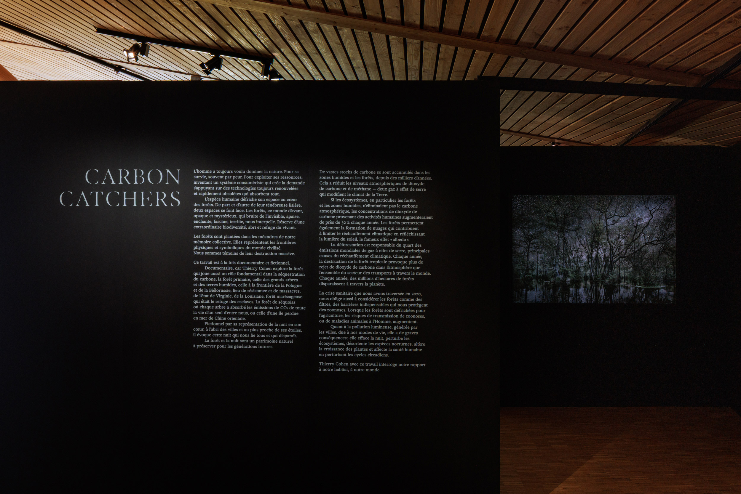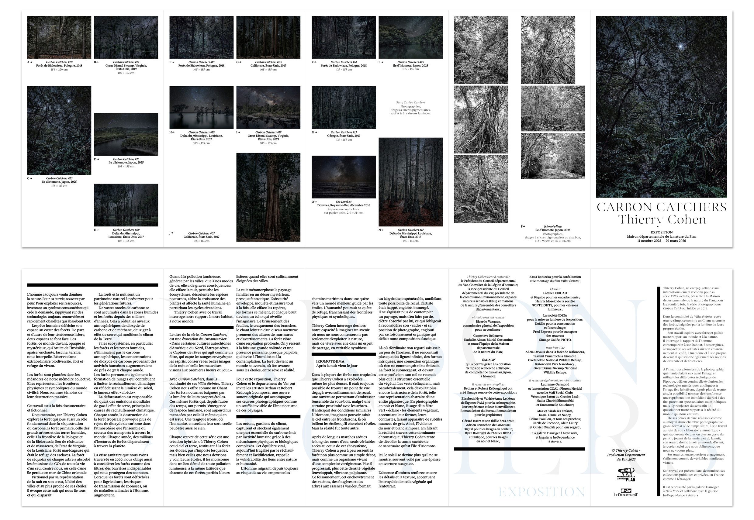 Graphisme de l’exposition Carbon Catchers, pour le photographe Thierry Cohen, à la Maison départementale de la nature du Plan. Sa série “Carbon Catchers” interroge la manière dont les forêts, la nuit, “absorbent” les émissions de carbone — ou du moins, comment la nature lutte en silence contre l’ombre environnementale.