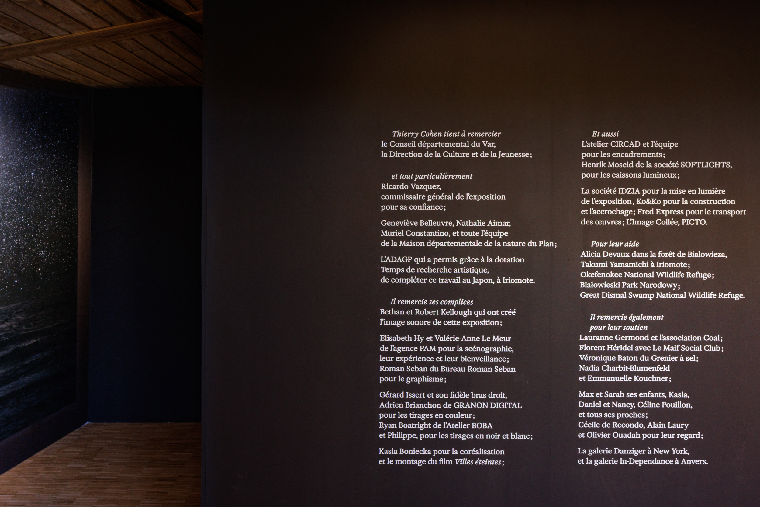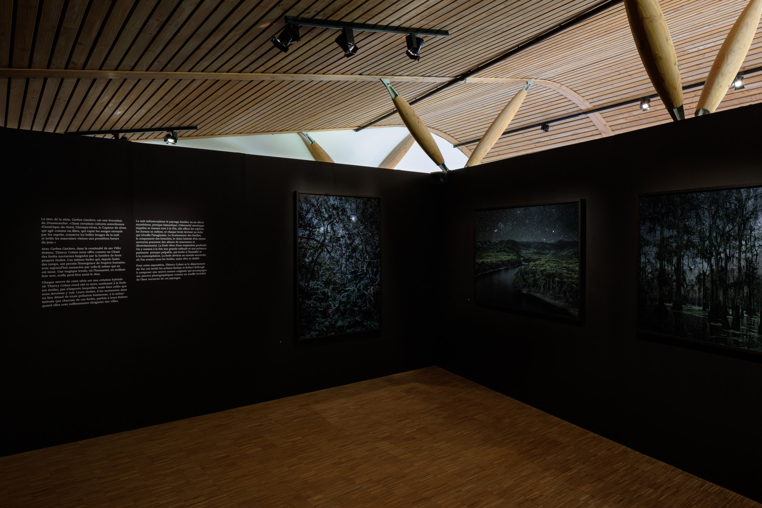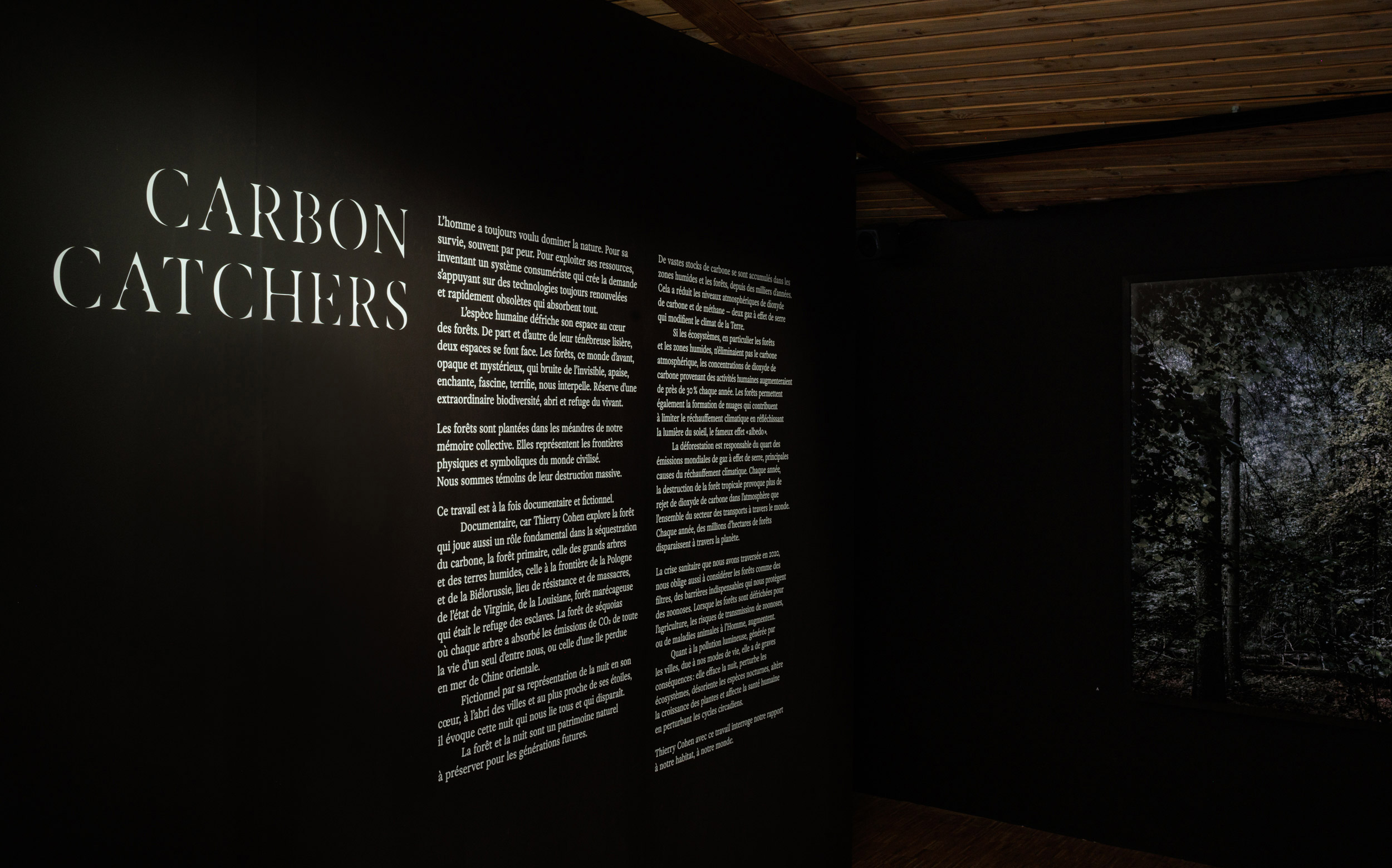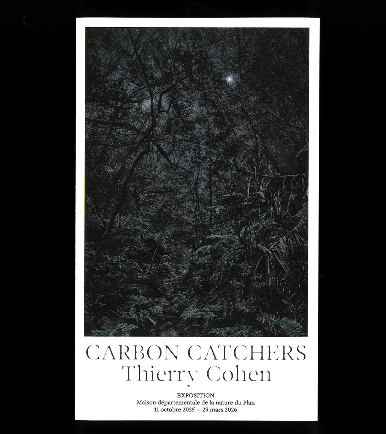 Graphisme de l’exposition Carbon Catchers, pour le photographe Thierry Cohen, à la Maison départementale de la nature du Plan. Sa série “Carbon Catchers” interroge la manière dont les forêts, la nuit, “absorbent” les émissions de carbone — ou du moins, comment la nature lutte en silence contre l’ombre environnementale.