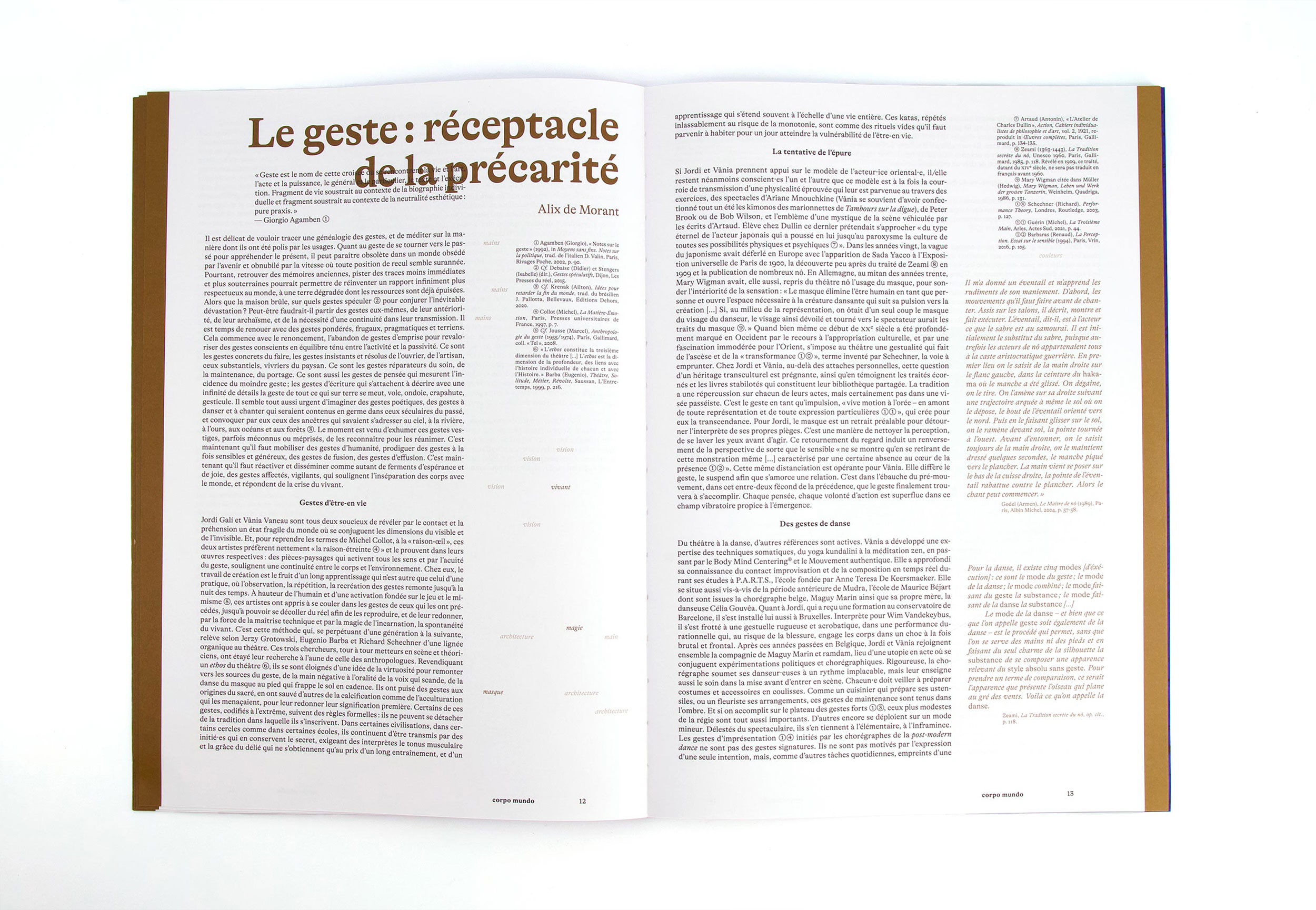 Corpo Mundo est une tentative esthétique de compréhension de notre environnement, par l’exploration d’écritures diverses qui interrogent l’expérience chorégraphique. Tout est mouvement en nous et à l’entour, de la particule quantique à l’Univers. Dès lors, quels outils pouvons-nous faire émerger au travers de la création chorégraphique pour faire apparaître les courants kinésiques qui animent et réaniment le monde ? Dans quelle mesure la relation au paysage, la fabrication d’artefacts, le soin que nous portons aux êtres (humains et non-humains) peuvent être considérés comme des expressions différentes d’une seule et même tentative ? Ce livre tente de rendre perceptible par l’expérience incarnée ce dialogue des énergies qui font que le monde devient monde en permanence.